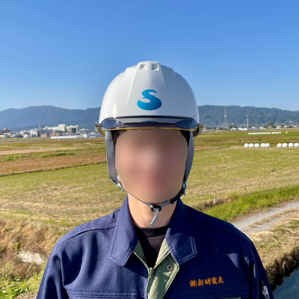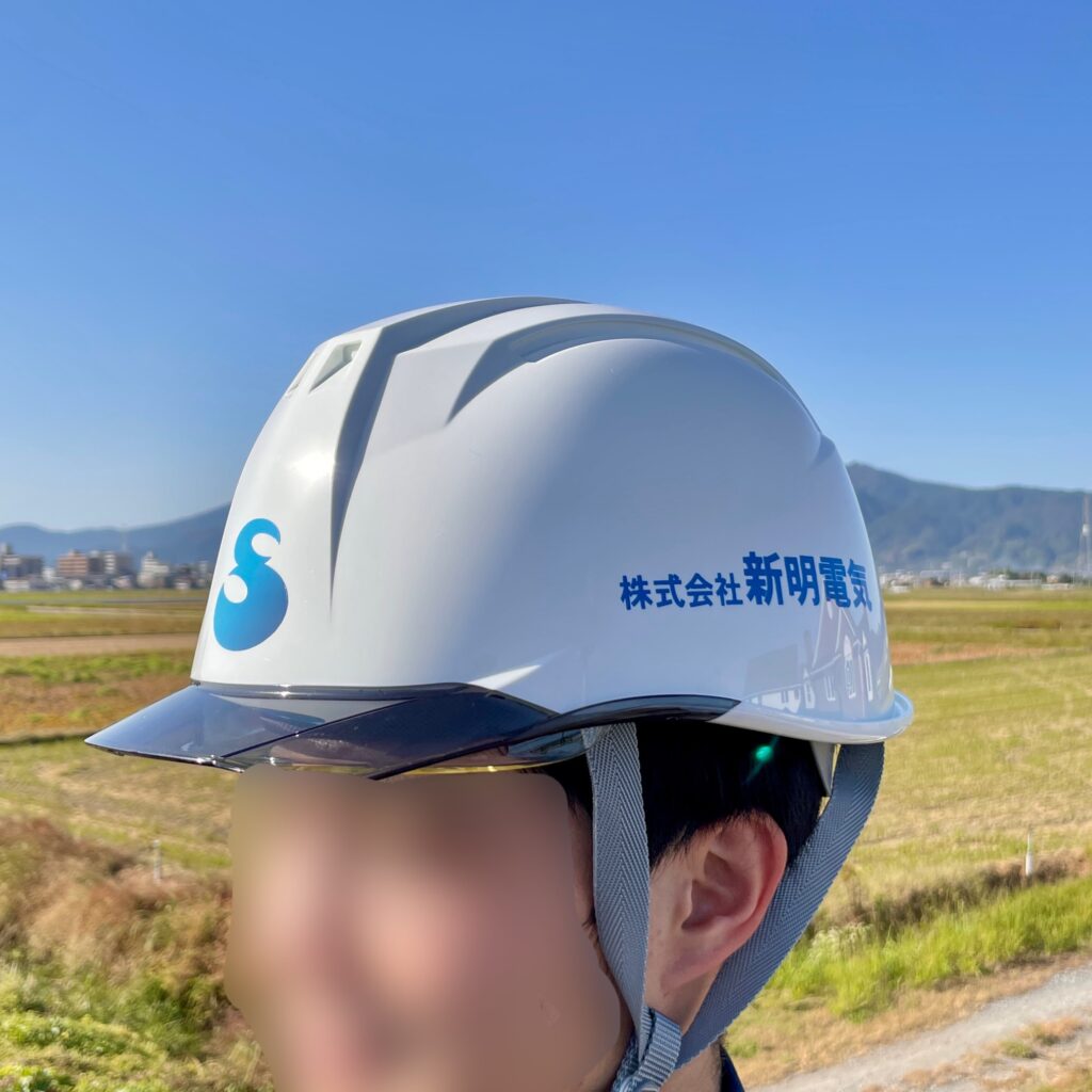 「新ロゴ入りの新明電気ヘルメット。軽くて視界も広く、スタッフにも好評です。」